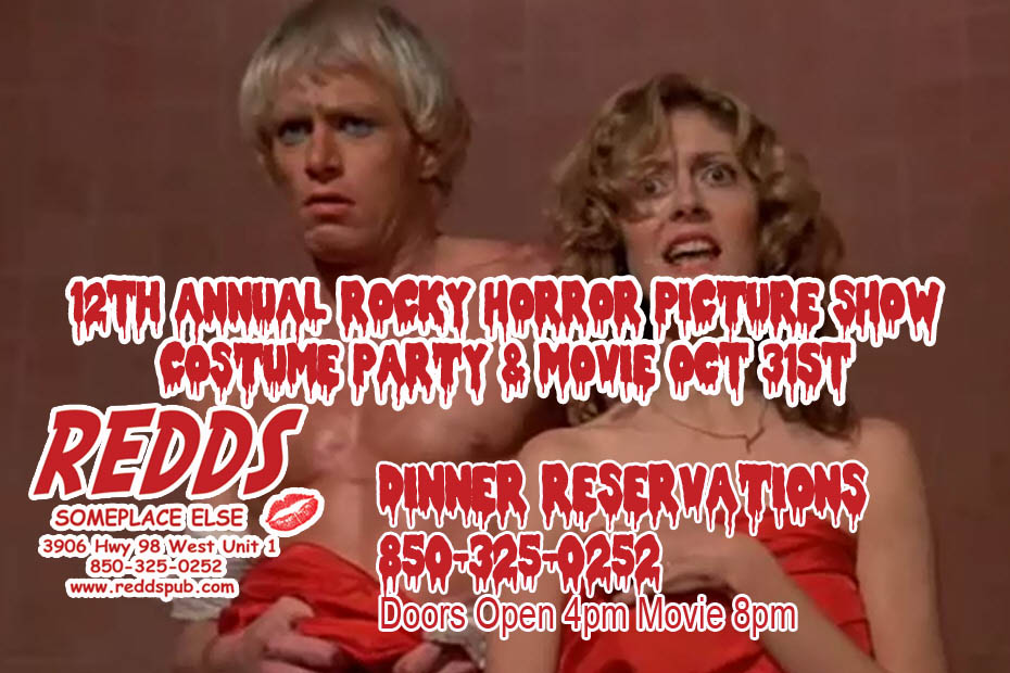 The annual tradition continues at Redds Pub with the 12th Annual Rocky Horror Picture show. Bring your best costume, newspapers, rice, noisemakers (just no water pistols please) and book your dinner table – Limited space – 850-325-0252 – Happy Hour 4-5pm Movie starts 8pm